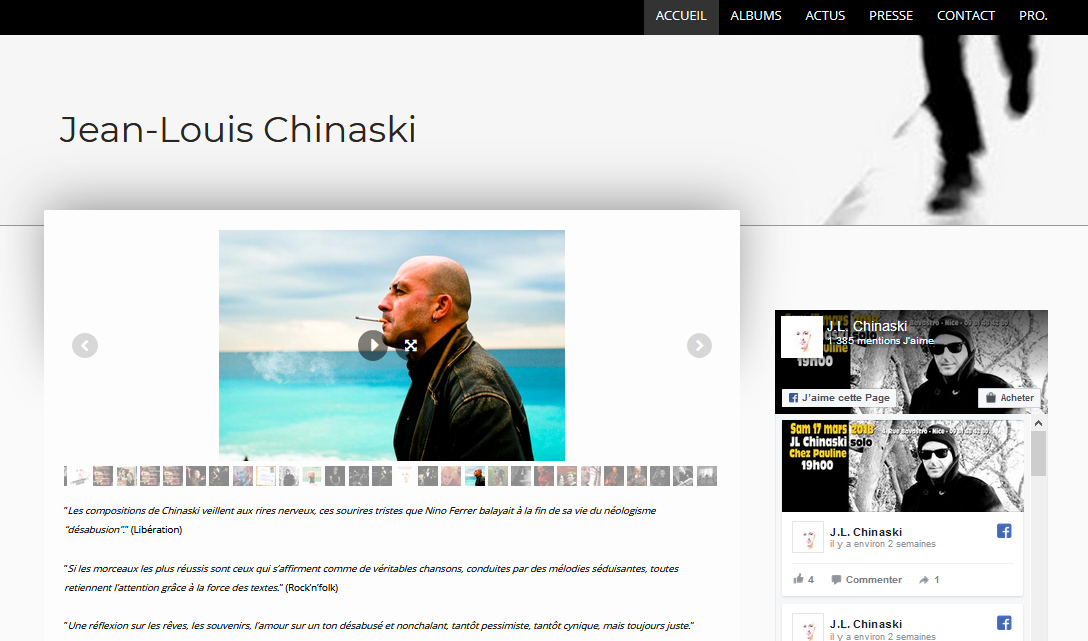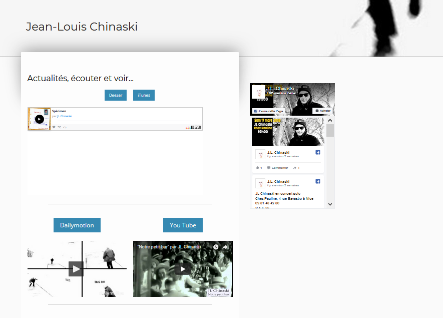 Jean-Louis a accepté une maquette et nous l’avons alors finalisé ensemble ; « Jean-Louis Chinaski » est maintenant autonome sur ses mises à jour de contenus. Un travail annexe a été réalisé sur sa chaîne youtube, réorganisée intégralement par album (car l’artiste créé une vidéo par titre et donc… une vraie mine !)